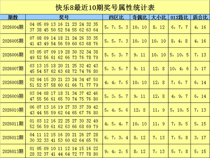 福彩快乐8第2026013期开奖回顾:01 05 09 10 11 12 14 15 16 22 28 32 37 41 44 64 72 77 78 80,其中尾数2包含4个号码,尾数1、4分别包含3个号码,尾数0、5、7、8分别包含2个号码,尾数6、9分别包含1个号码,尾数3没有出现。