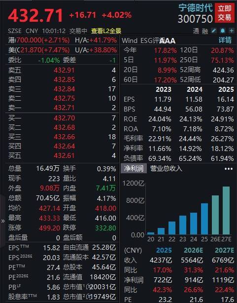 宁德时代盘中涨超4%,股价再创历史新高,总市值突破2万亿元。