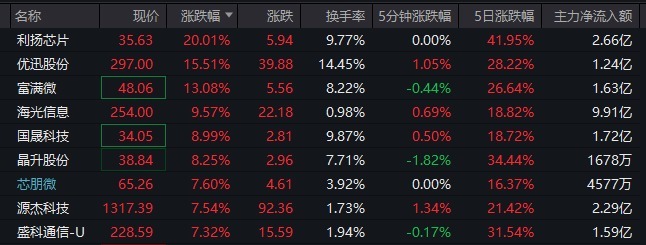 半导体概念拉涨,利扬芯片20.01%涨停,优选股份、富满微、海光信息涨超10%。