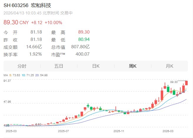 热点方面,宏和科技10%涨停,股价再创历史新高,最新市值808亿元。宏和科技2025年实现归属于上市公司股东的净利润为2.02亿元,同比增长785.55%。宏和科技是2025年资本市场“大牛股”之一,2025年4月9日,公司股价触及波段最低,随后开启新一波上涨,2026年2月26日达到85.83元/股的历史高位,波段期间涨幅达到1000%。